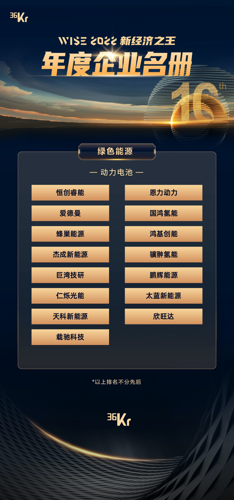 11月29日,36氪“WISE2022 新經濟之王 年度企業”名單盛大發布,作為全球電池回收綜合利用探路者,恒創睿能榮幸入選綠色能源領域年度企業榜單。